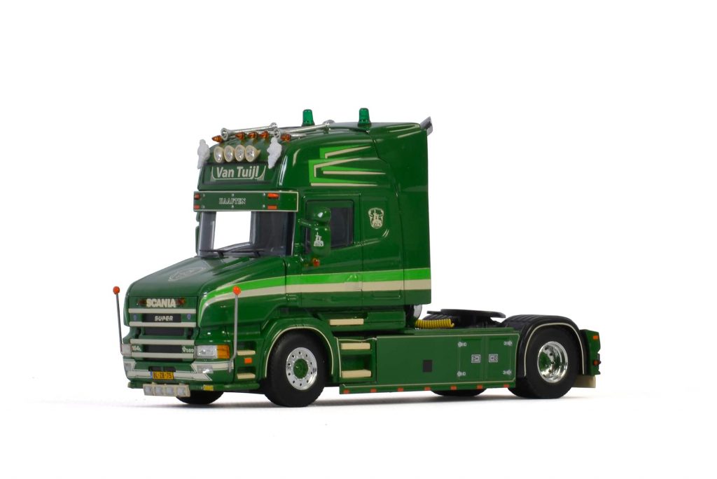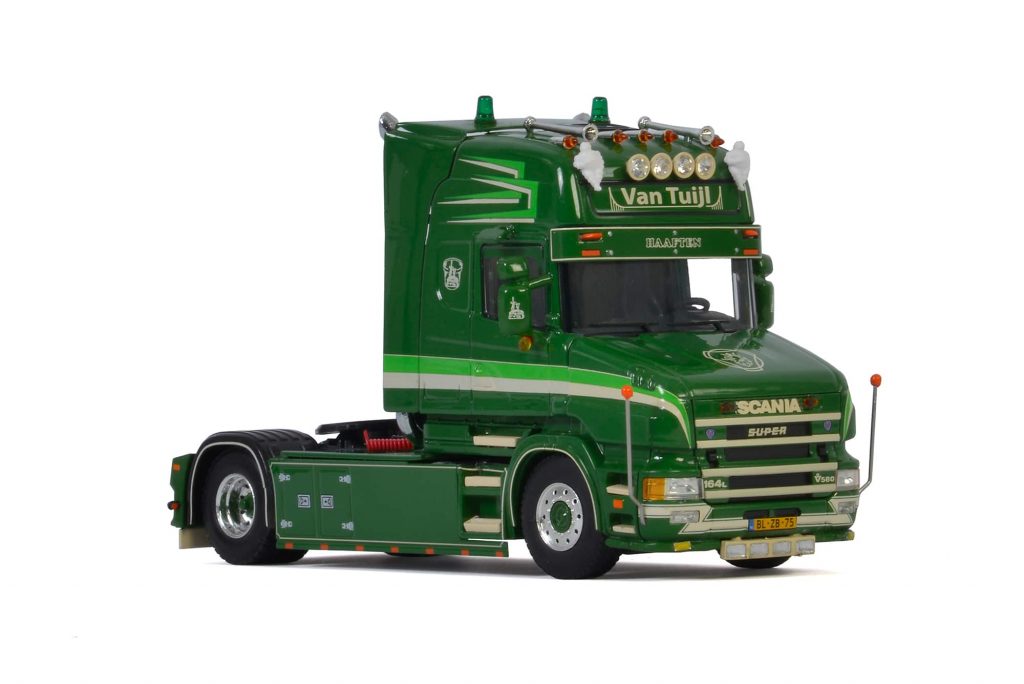 Met de fraaie donkergroene kleurstelling is de Scania T164 van Van Tuijl uit Haaften een frisse verschijning. De truck is door WSI verkleind naar schaal 1 op 50 en wordt als losse trekker geleverd. (PGe)