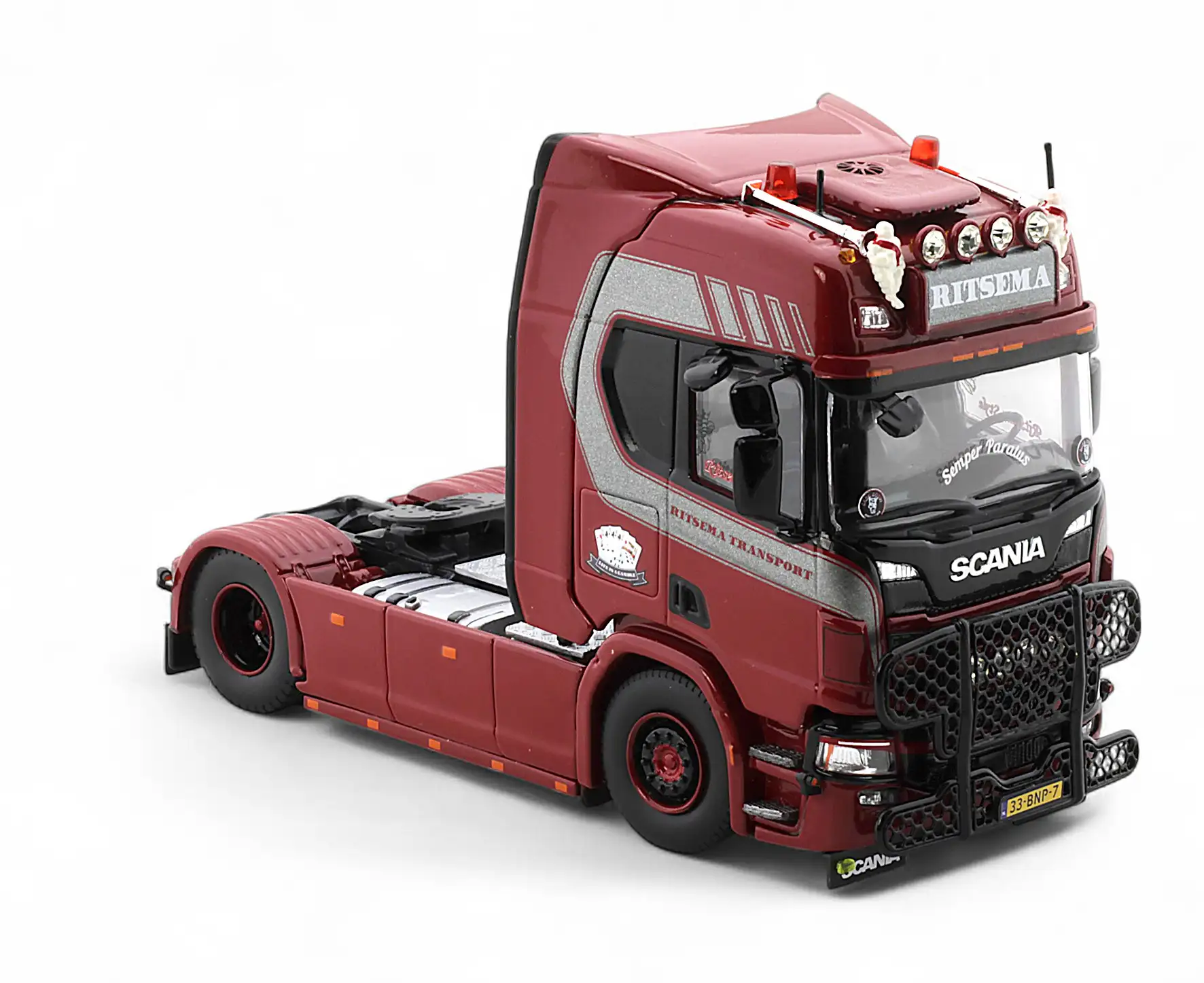 Donkerrood is de basiskleur van Ritsema Transport uit Beilen. Maar het front van deze Scania R-serie Next Gen Highline 4×2 trekker is vooral zwart. Niet alleen de grille, maar ook de bullbar die van deze trekker een stoere verschijning maakt. Er is niet bespaard op uitrusting en toevoegingen zoals de lichtbak, Michelin-mannetjes, chromen luchthoorns en extra verlichting. Maker Tekno voorziet deze Scania van onderrijbeveiliging in de cabinekleur. (TV)