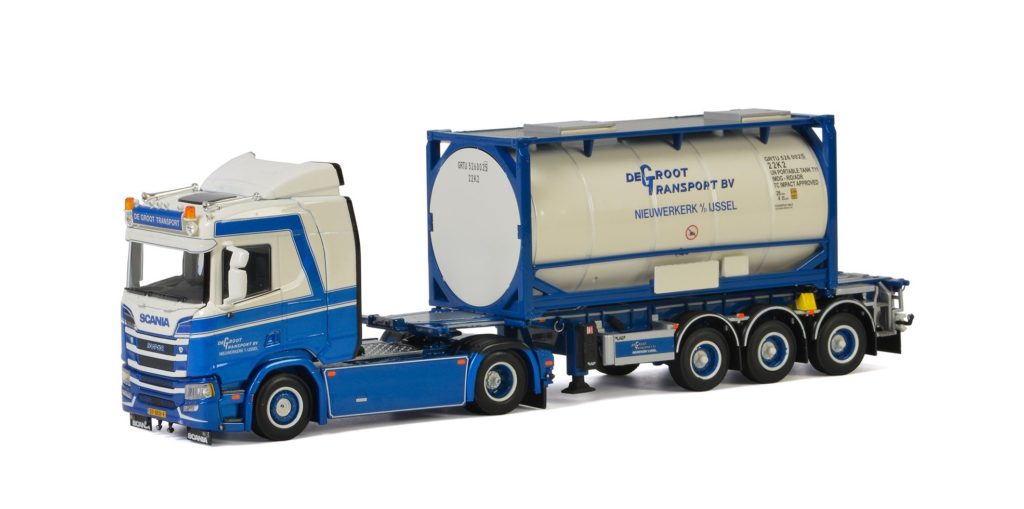 Mooi voorbeeld van hedendaags vervoer van WSI. Deze Scania R450 4×2 trekker met drieassige container-oplegger geladen met een 20ft tankcontainer. M.J. de Groot Transport B.V. uit Nieuwerkerk aan den IJssel rijdt ermee.