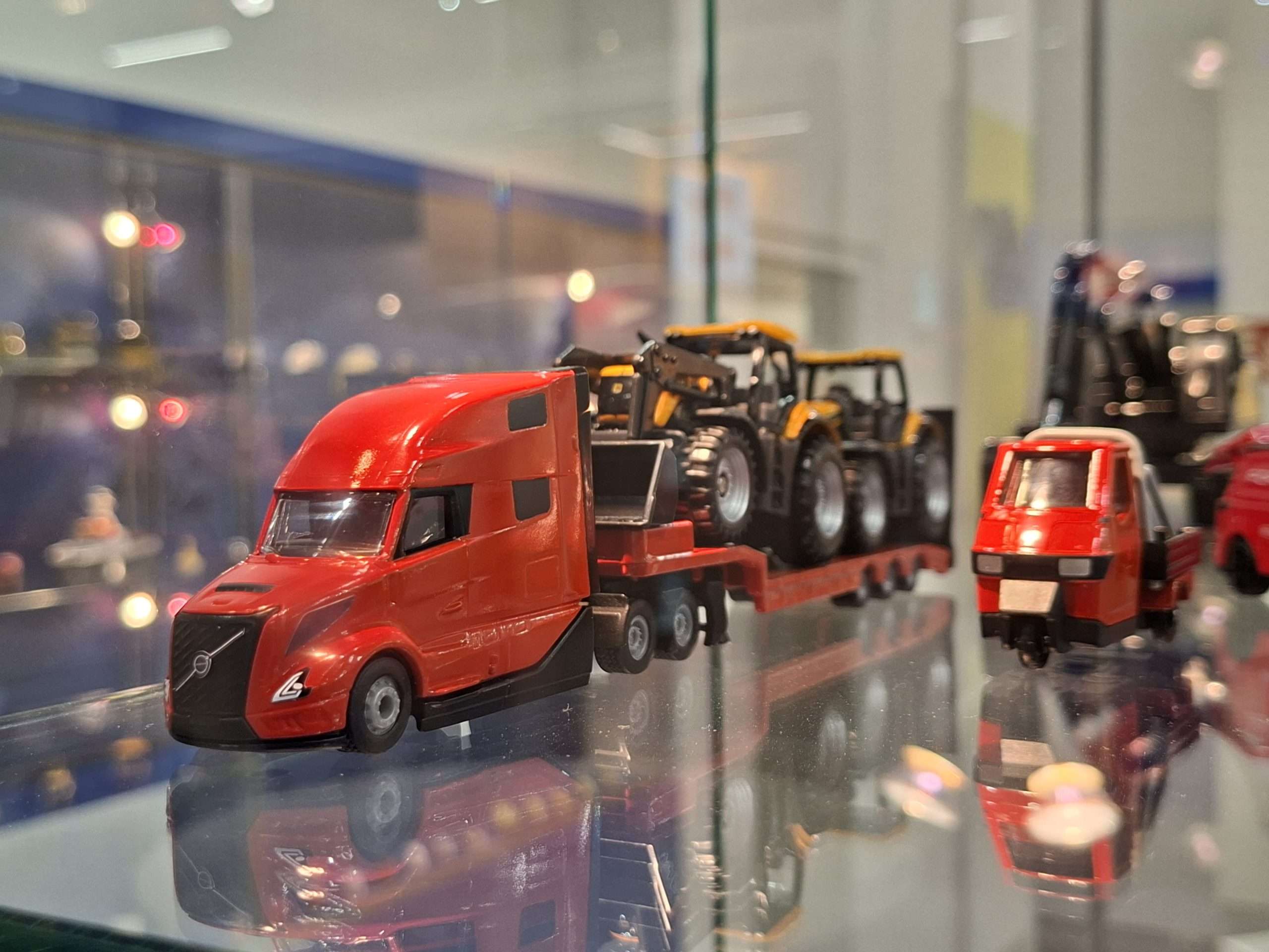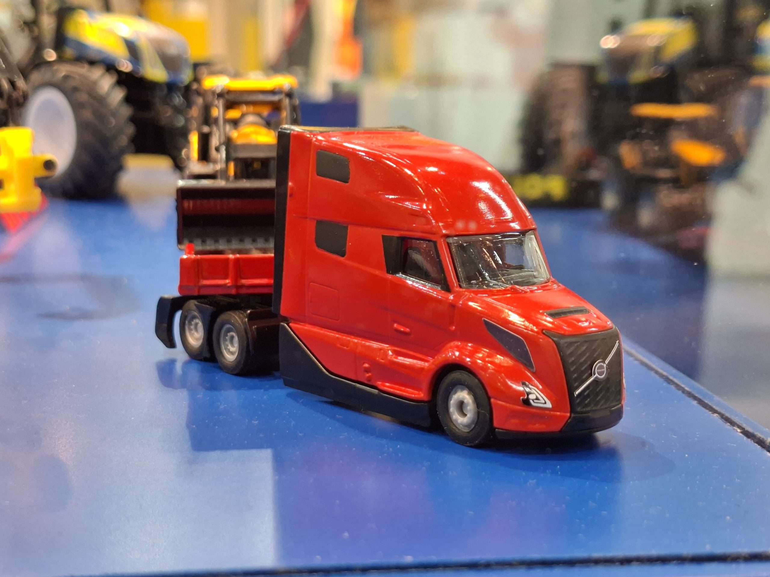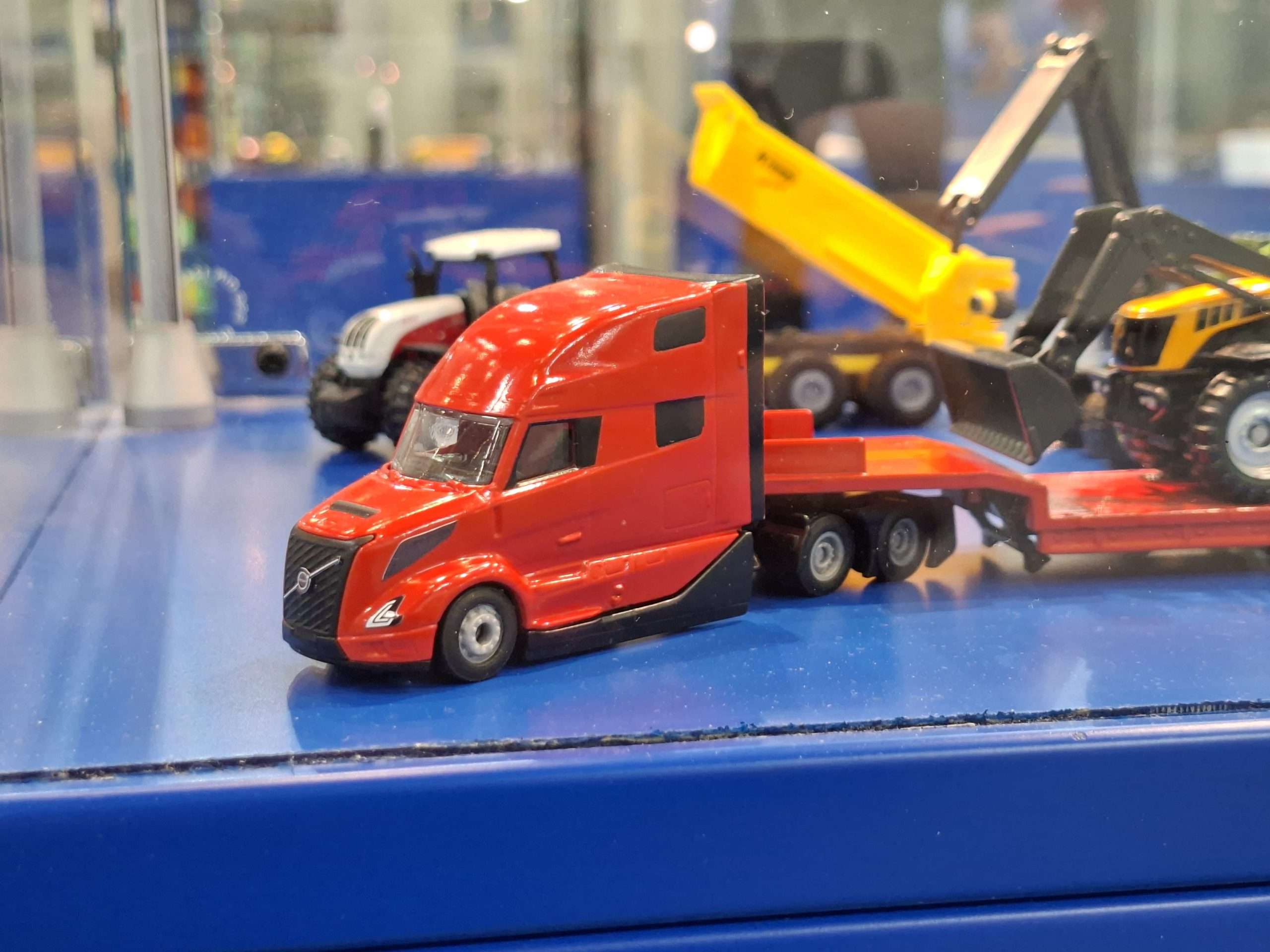 In 1:87 zien we twee ook in 1:1 heel actuele Volvo’s. Voor op het asfalt is dat de Amerikaanse Volvo VN van modeljaar 2024, die in eerste instantie verschijnt in neutraal rood met dieplader met grote JCB-tractoren. Volledig nieuw voor naast het asfalt is de Volvo A40J knikdumper. (NJ)