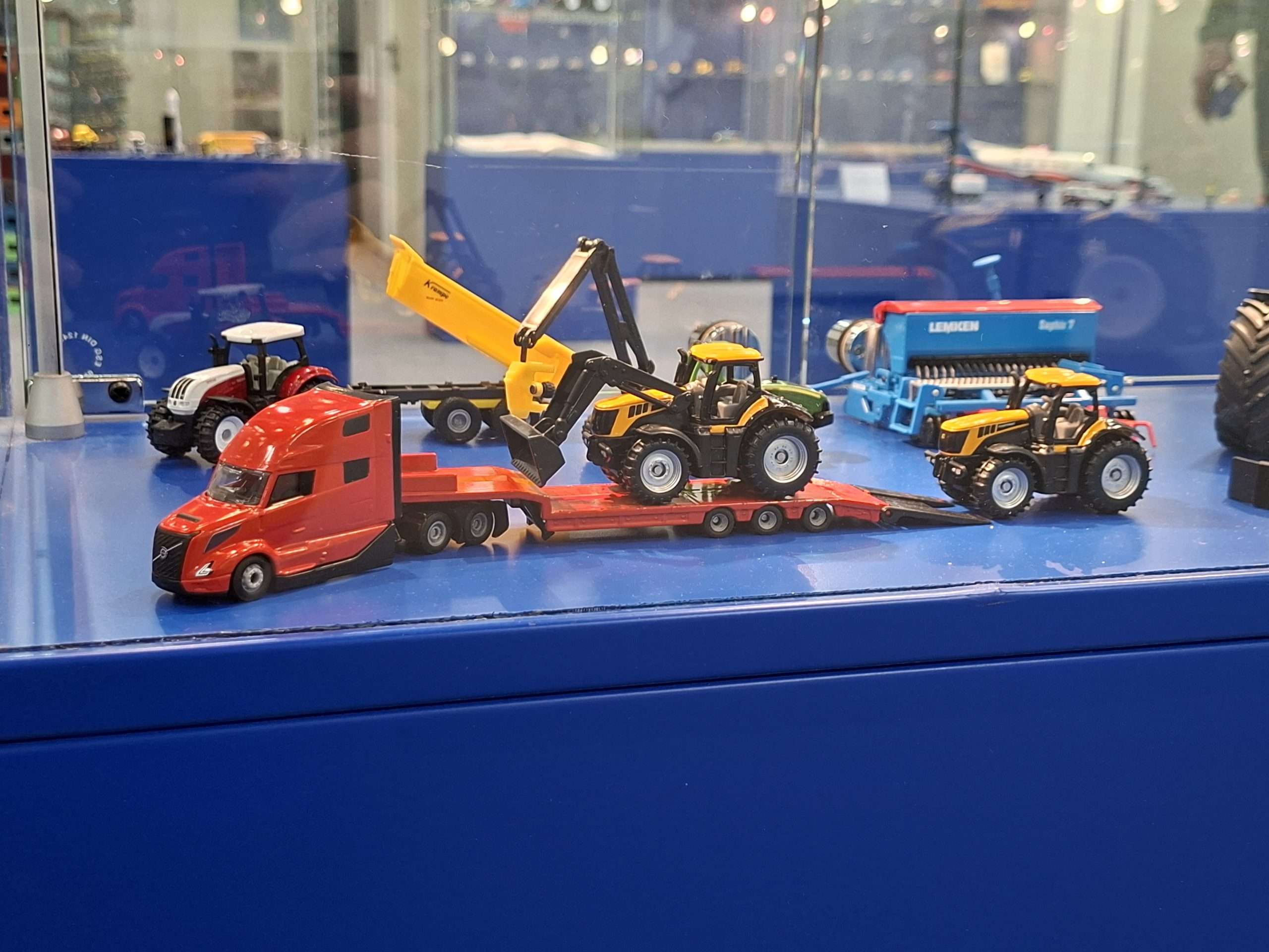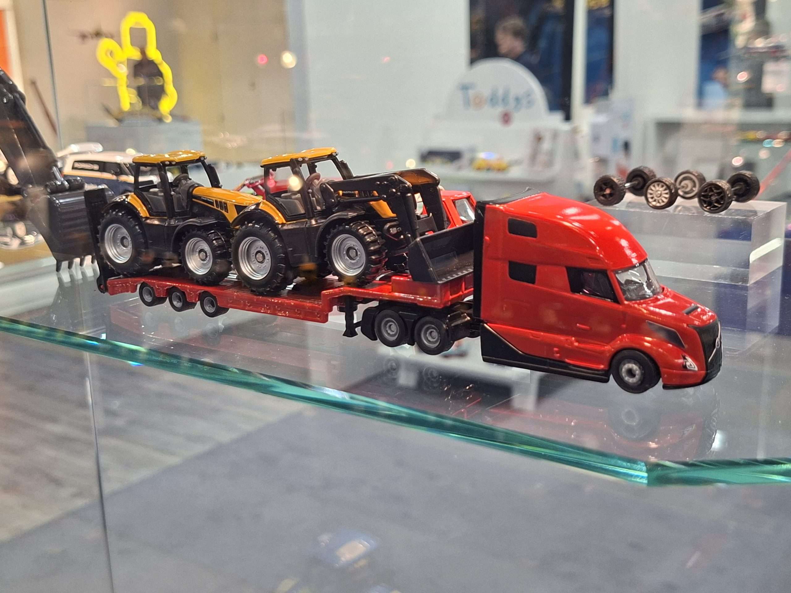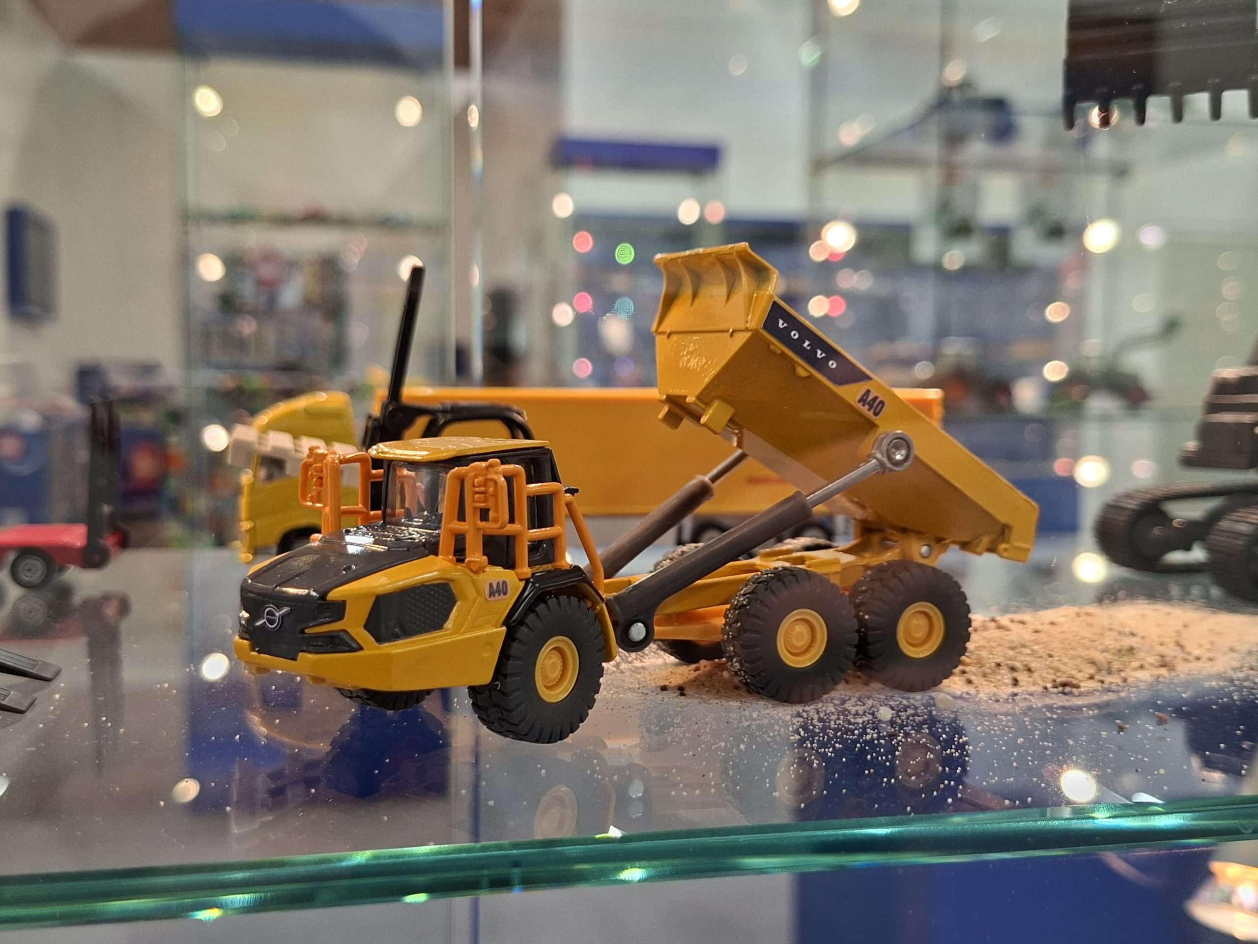 In 1:87 zien we twee ook in 1:1 heel actuele Volvo’s. Voor op het asfalt is dat de Amerikaanse Volvo VN van modeljaar 2024, die in eerste instantie verschijnt in neutraal rood met dieplader met grote JCB-tractoren. Volledig nieuw voor naast het asfalt is de Volvo A40J knikdumper. (NJ)