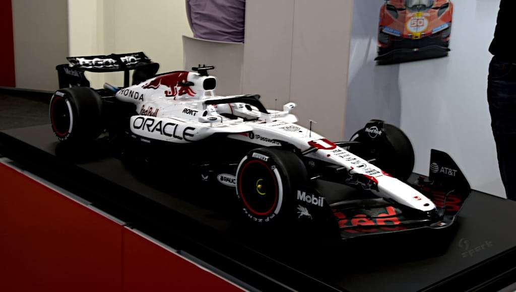 Het meest opvallende model op de Spark-stand was de enorme Red Bull in schaal 1:8. Heel voorzichtig heeft men de kap van de vitrine afgehaald zodat we dit dure pronkstuk konden fotograferen.