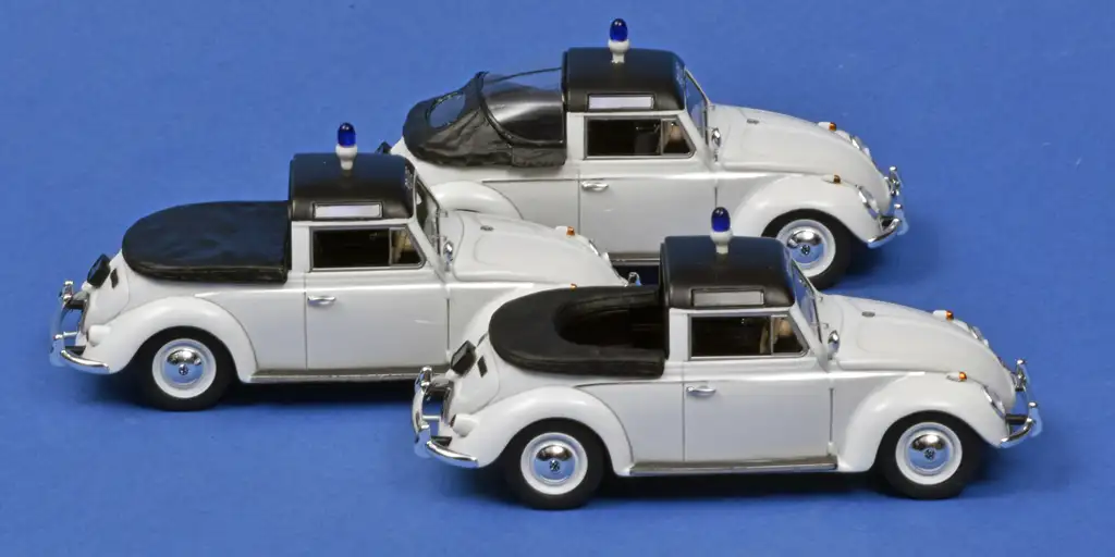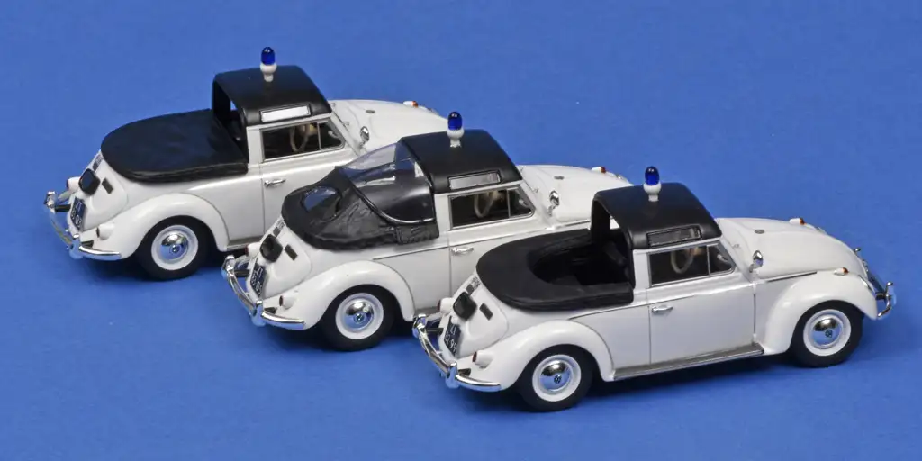 Geloof het of niet, maar eind jaren vijftig hebben er in Den Haag enkele speciale politie-uitvoeringen van de alom bekende VW Kever rondgereden. Deze kevers hadden geen achterbank, maar een speciale kuip. In deze uitvoeringen konden dronkaards of gevonden attributen, zoals fietsen, vervoerd worden. De kentekens ZT-82-99, ZT-83-03 en ZT-83-05 hebben de drie politiekevers echt gesierd. De unieke modellen van deze politiekevers met kuip coach heeft Matrix Scale Models in drie verschillende uitvoeringen gemaakt. Wie anders. (BSp)