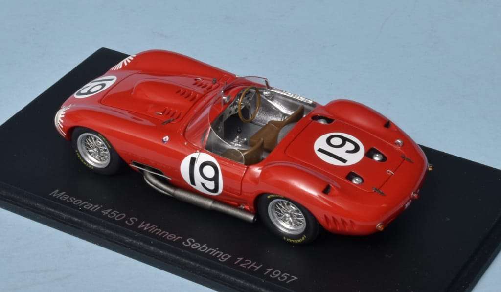 De Maserati 450S was een pure racewagen waarvan er slechts negen gebouwd zijn. Een voorin gemonteerde 4,5 liter V8 zorgde voor de aandrijving. De van 1956 tot 1958 gebouwde racers namen vooral deel aan FIA’s World Sportscar Championship. De successen waren heel wisselend. Uitvallen en winnen wisselden elkaar af. In 1957 won het duo Juan Manuel Fangio / Jean Behra de 12 Hours of Sebring. Spark maakt het mooie model van de Maserati 450S. (BSp)