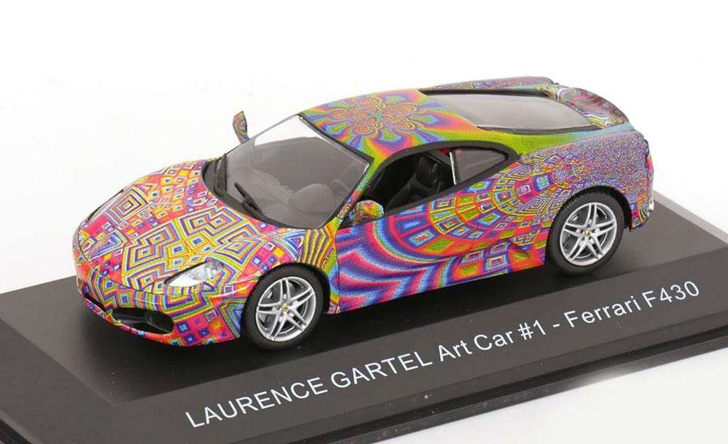 De bekendste Art Cars zijn de door bekende kunstenaars beschilderde BMW’s. Maar de Amerikaan Laurence Gartel kan er ook wat van. Alleen hij schildert niet. Hij maakt z’n ontwerp op een computer waarna er een wrap van het ontwerp gemaakt wordt. Die dunne kunststof huid wordt vervolgens heel voorzichtig op de auto aangebracht. In dit geval is het een Ferrari F430 Scuderia. Het kunstwerk is in 2011 ontstaan. Iconic Replicas maakt het kunstig bedrukte model van voornoemde Ferrari. Prachtig toch. Gezien bij Modelissimo. (BSp)