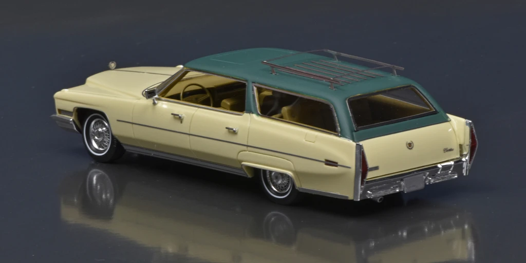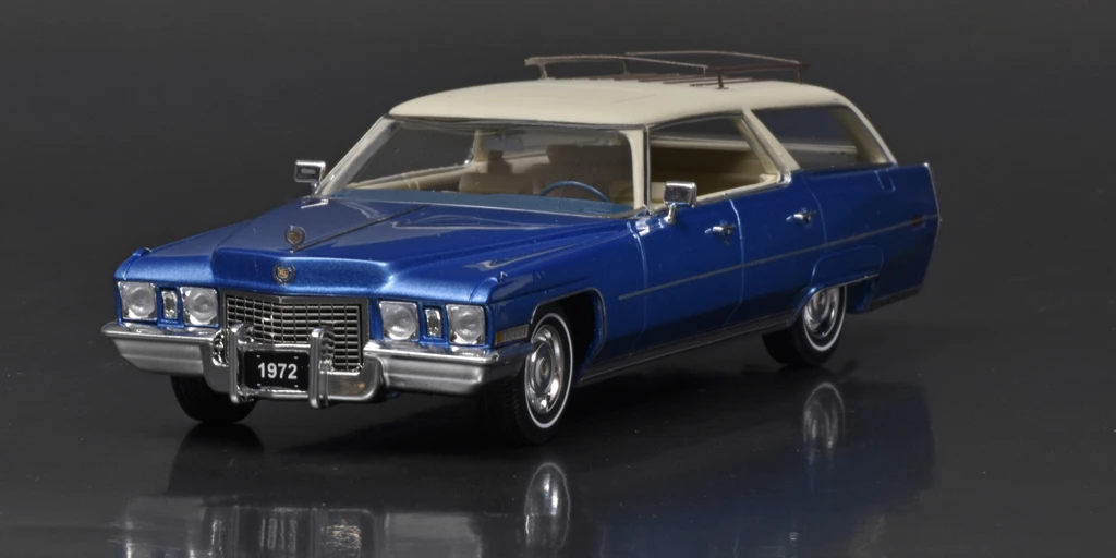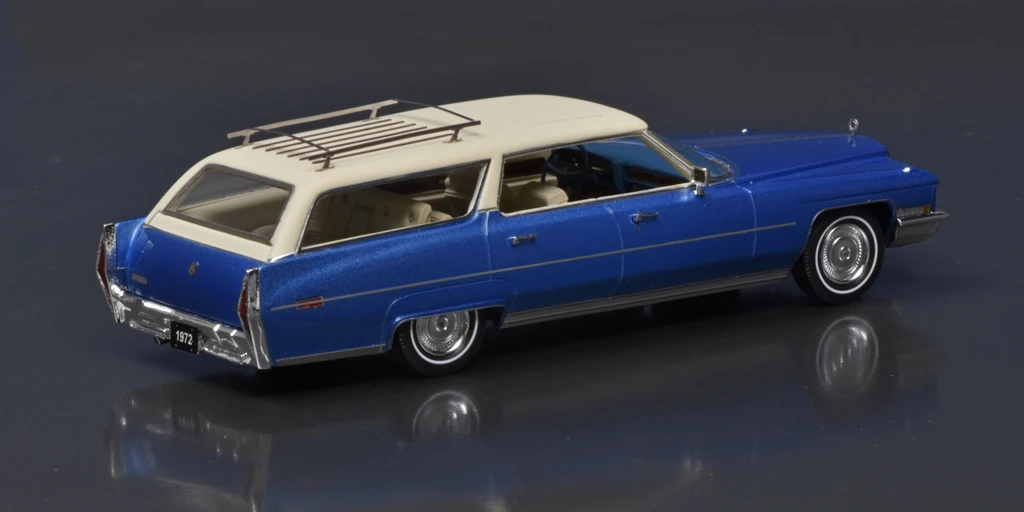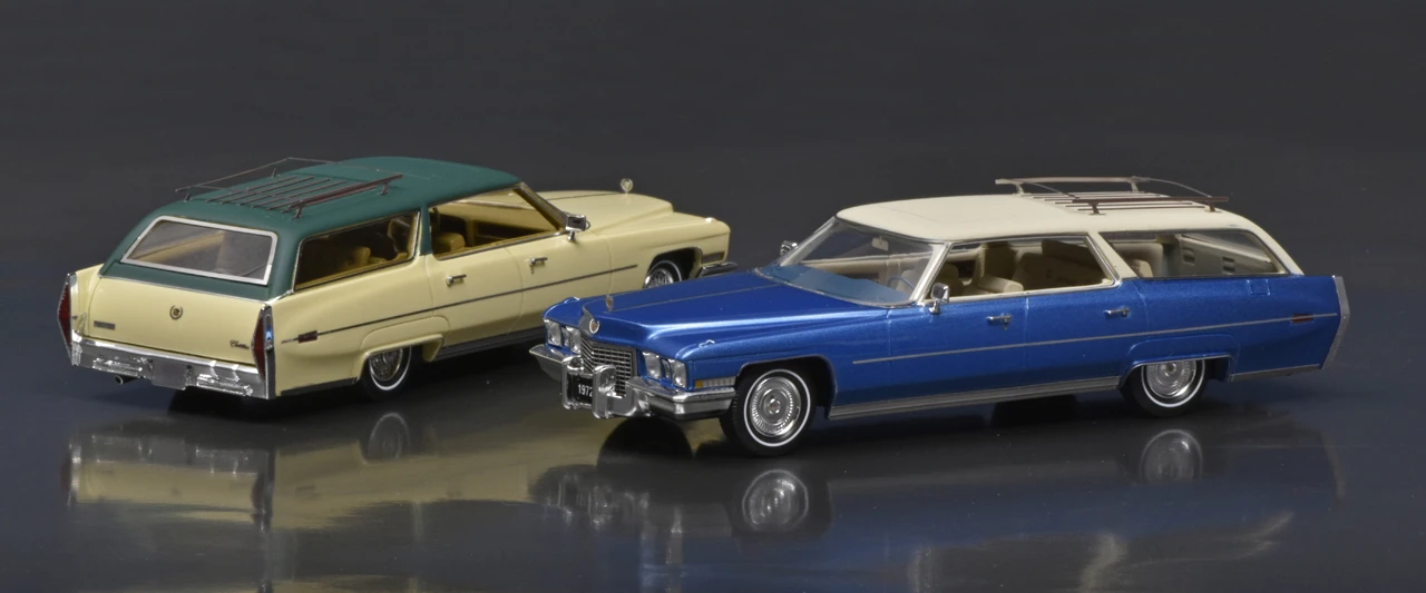 De American Sunroof Company bouwde twee stationwagons op basis van de 1972 Cadillac Sedan DeVille. Naar zeggen is de crème-groene ooit van Dean Martin geweest en op het www las ik dat de metallicblauwe met crème dak ooit van Elvis Presley is geweest. Uiteraard zijn de auto’s van alle luxe voorzien. Tot 2018 heeft de Dean Martin Cadillac een Nederlands kenteken gehad en is toen naar de VS gere-importeerd. Hoe het ook zij, de beide door Matrix Scale Models gemaakt 1:43 Cadillacs zijn zonder meer prachtig. (BSp)