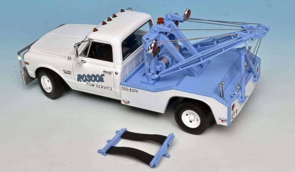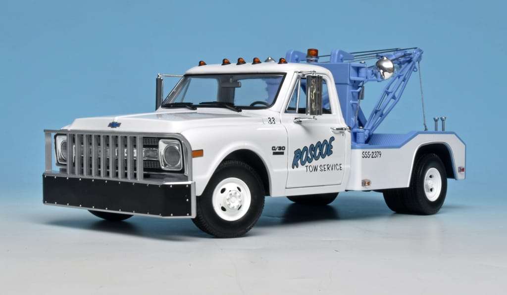 Toen Chevrolet in 1960 de nieuwe pick-up serie voorstelde kon je o.a. kiezen uit de C10 (halve ton), C20 (driekwart ton) en C30 (een ton) uitvoering. De laatste was de zwaarste en de sterkste en daarmee uitermate geschikt als afsleepauto van personenwagens en lichte bedrijfsvoertuigen. De opbouw is typisch Amerikaans, maar wel effectief. Greenlight maakt dit leuke 1:18 model van de Chevrolet C30 Dual Wrecker uit 1969. (BSp)
