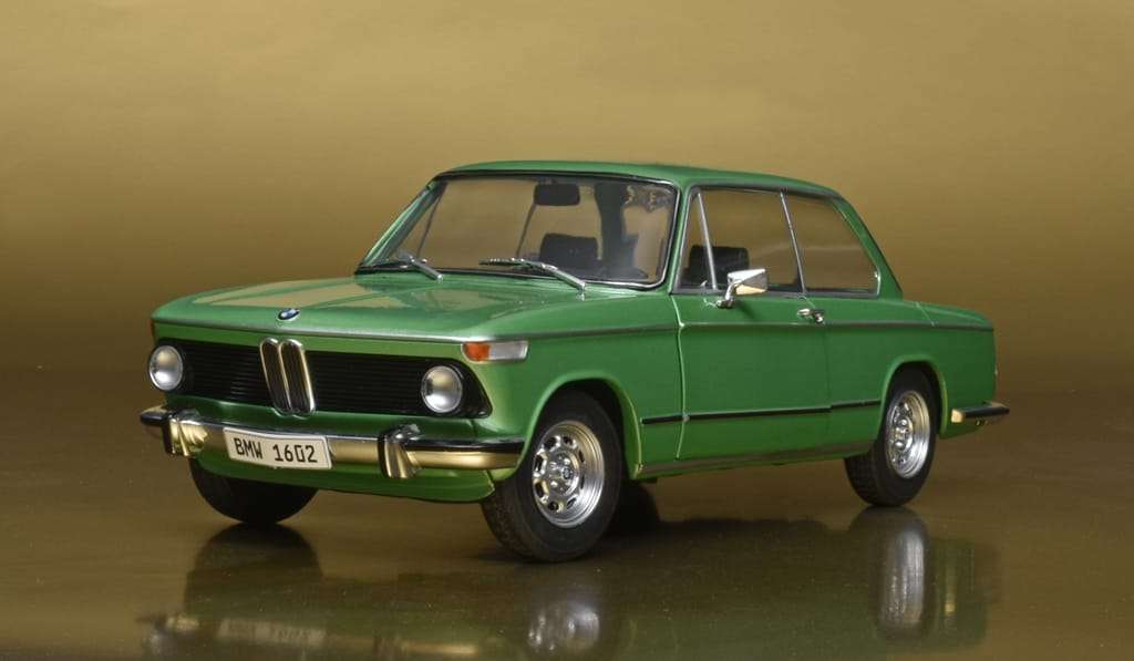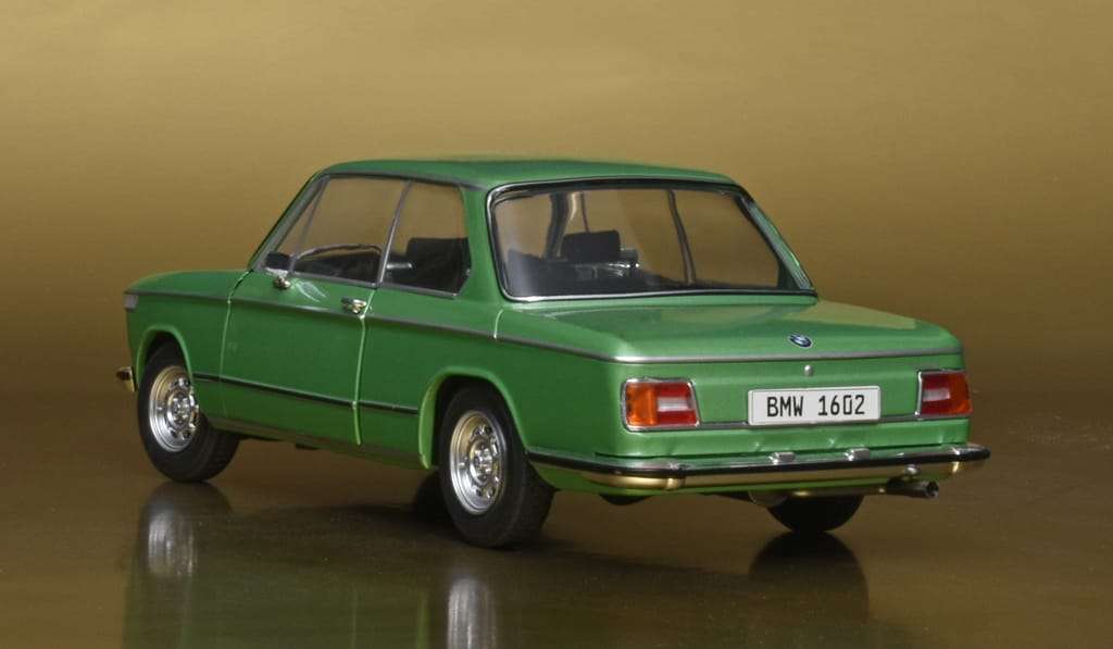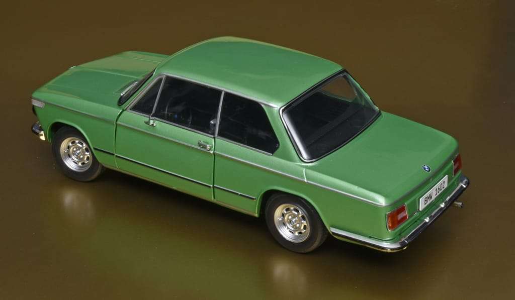 Solido is niet het eerste modelmerk dat een 1:18 model van de vermaarde kleine BMW 1602 maakt. Vreemd genoeg noemt Solido als bouwjaar 1971 maar dit is toch echt een exemplaar van de tweede generatie die in 1973 verscheen. Opvallendste kenmerken hiervan zijn de vierkante achterlichten en de zwarte kunststof grille. De eerdere modellen hadden ronde achterlichten en een verchroomde grille. Desondanks is het een mooi miniatuur in typisch jaren 70 groen. (BSp)