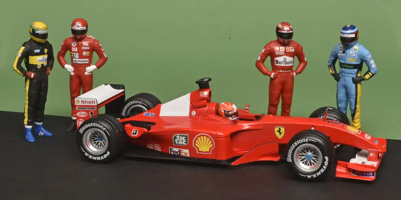 Liefhebbers van de Formule1 en verzamelaars van bijbehorende bolides kunnen hun hart ophalen, want Cartrix heeft van heel veel F1-wereldkampioenen figuurtjes gemaakt. Een klein deel is afgebeeld. Vanaf links zijn dat Ayrton Senna, Niki Lauda, Michael Schumacher en Fernando Alonso. Eigenlijk zijn de heren alleen maar te herkennen aan hun racepakken en helmen. Een vergelijking met ridders ligt dan voor de hand, want ook zij streden met gesloten vizier. (BSp)