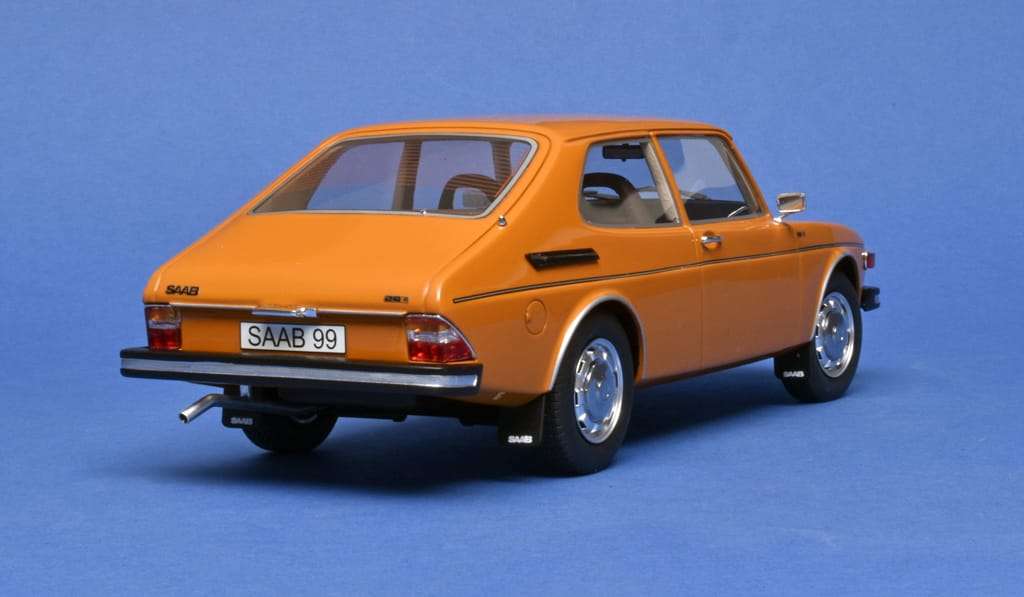 Eind jaren zestig introduceerde Saab de grotere Saab 99, die niet door de bekende Ford V4, maar door een Triumph vier-in-lijn aangedreven werd. De auto was voorzien van de nodige veiligheidsfeatures met o.a. een aan de voorzijde scharnierende motorkap die eerst iets naar voren geschoven moest worden voordat-ie geopend kon worden. In 1974 werd de elf centimeter langere CC, de Combi Coupé, aan het leveringsprogramma toegevoegd. Die extra centimeters gaven de auto een ander profiel waarbij het kofferdeksel plaats moest maken voor een grote achterklep. Het prima 1:18 resin model is van Cult Scale Models. (BSp)