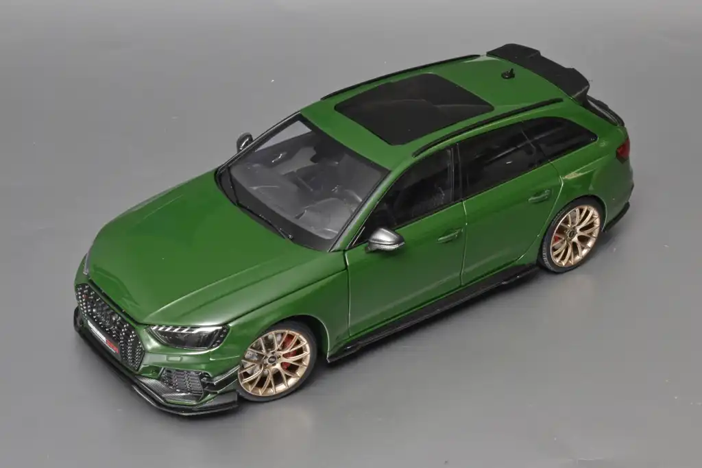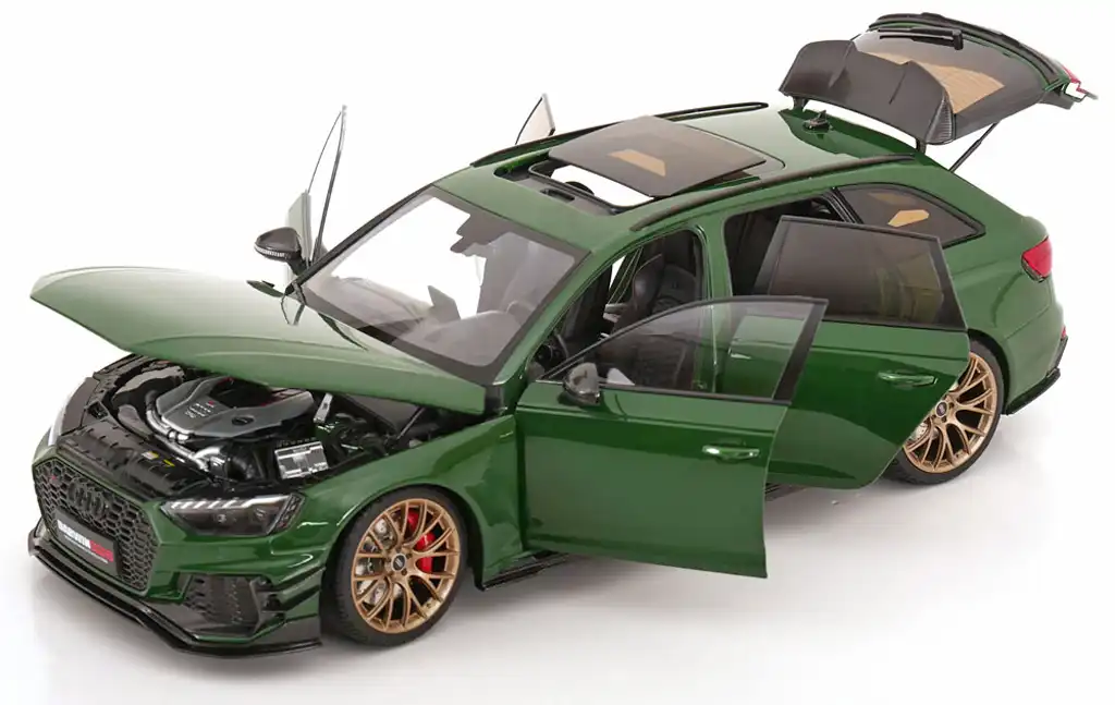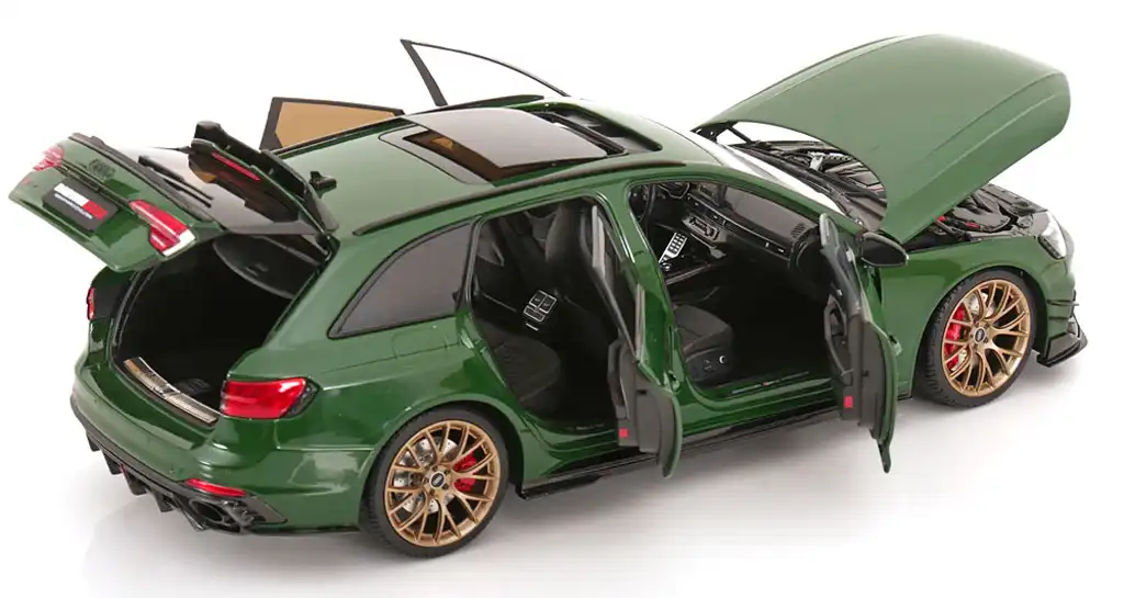 Over het modelmerk KiloWorks heb ik heel weinig info, behalve dat dit nieuwe modelmerk (uiteraard) in China gemaakt wordt. Het prachtige 1:18 model van de Audi RS4 Avant B9 Darwin Pro is zeer gedetailleerd en prima afgewerkt. Alles kan geopend worden, zelfs het schuifkanteldak, waardoor er vervolgens nog veel meer te bewonderen valt. In een woord: Prachtig! Bewonder de overtuigende foto’s. Wij zagen deze beauty bij Modelissimo. (BSp)