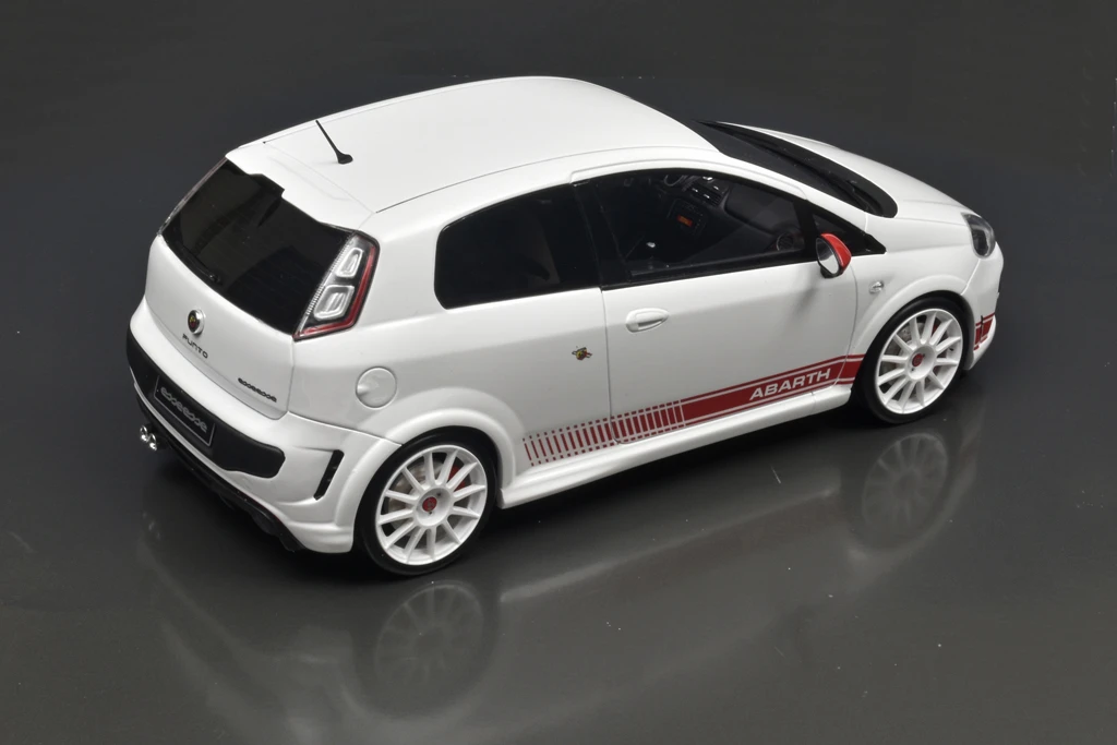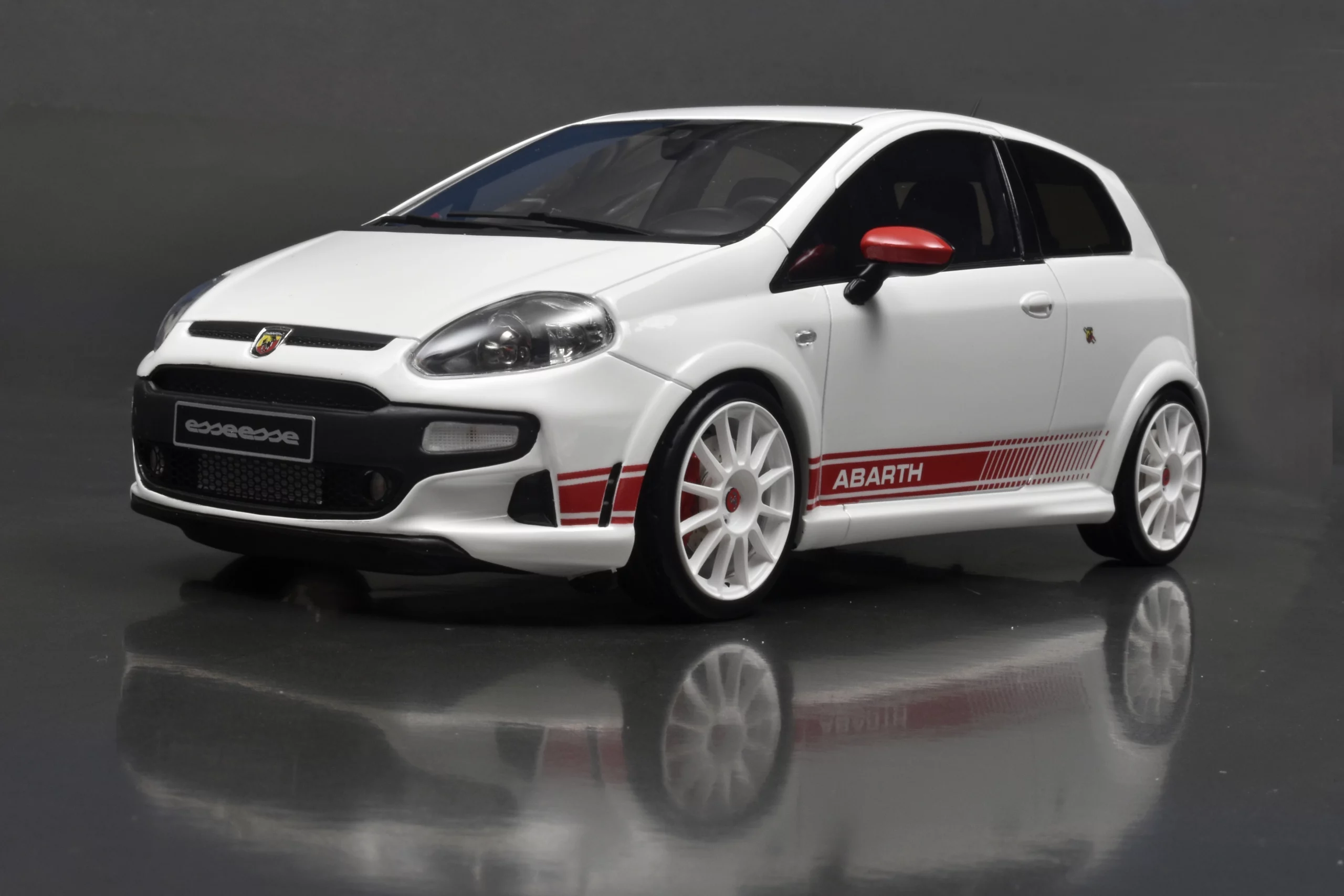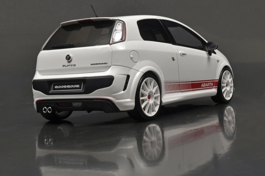Op de Fiat Abarth Punto Evo EsseEsse zul je geen Fiat badge vinden. ’t Is dus een Abarth en dat betekent rijplezier. Vooral als het EsseEsse-pakket ingebouwd is. Dat houdt o.a. in dat de auto verlaagd wordt, speciale lichtmetalen velgen en een Brembo remsysteem krijgt. Maar het belangrijkste is 15 pk meer vermogen door een nieuw uitlaatsysteem en een open luchtfilter. Het zo ontstane scheurijzer daagt de bestuurder constant uit om al dat vermogen te gebruiken. OttO Mobile tekent voor dit mooie 1:18 model. (BSp)