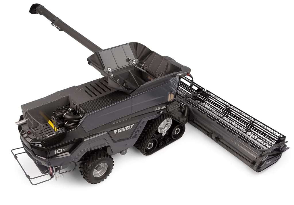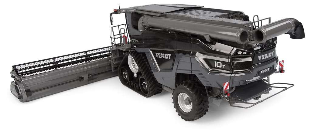 Alles aan de Fendt Ideal 10T maaidorser is groot, een machine van superlatieven. Zo maar wat afmetingen. De transportstand van deze bijna 27 ton wegende kolos (lxbxh) is 10,6 x 3,5 x 4 m en ze wordt aangedreven door een 790 pk sterke MAN-diesel. Het meest gebruikte maaibord heeft een breedte van iets meer dan 12 meter en deze gigant heeft een graanreservoir van 17.100 liter, oftewel 17 kuub. Om het gewicht beter te kunnen verdelen en de kracht van de motor goed te kunnen gebruiken zijn de aangedreven wielen vervangen door tracks. Dit waren nog maar de cijfers. Meer weten? De Fendt-website geeft meer info. Het prachtige en gedetailleerde 1:32 model is echter van Universal Hobbies. (BSp)