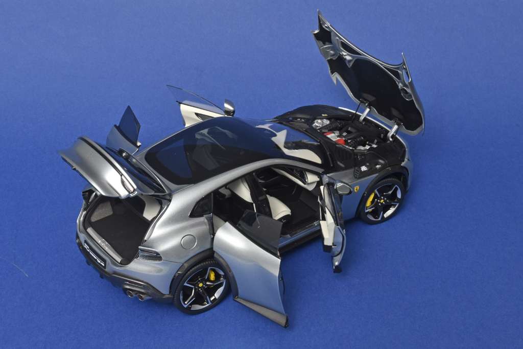 Het woord Purosangue klinkt als zoveel Italiaanse woorden… poëtisch. Vertaald in begrijpelijk Nederlands betekent het volbloed, een temperamentvol paard. En aangezien in het Ferrari-embleem een steigerende volbloed is afgebeeld, is dat plausibel. Minder plausibel is dat Ferrari toch besloten heeft een SUV te bouwen. Maar het is hun vergeven. De vierpersoons, vierdeursauto heeft daarbij ook volop Ferrari-DNA. BBR is een van de modelmerken die de Ferrari Purosangue heeft verkleind, en hoe. Alle portieren openen en sluiten perfect en daarachter vind je ook het nodige om te bewonderen. Daarbij is het 1:18 model ook nog eens prachtig afgewerkt. (BSp)