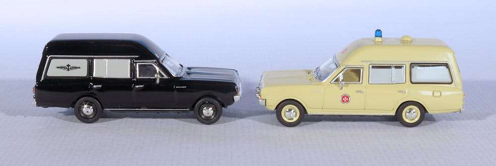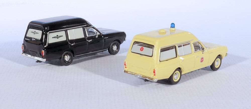 Eén van de bekendste carrosseriebouwers in Duitsland is C. Miesen uit Bonn. Het bedrijf bestaat al sinds 1870, maar we kennen vooral hun ambulances. Eigenlijk maakte het niet uit wat voor auto, Miesen maakte er een ambulance of rouwauto van. Brekina koos voor een minder voor de hand liggend model, de Opel Rekord C uit 1966. De middenklasser werd ontdaan van z’n achterkant en er ontstond een ambulance. Brekina levert de Rekord C ook als rouwwagen. (BSg)