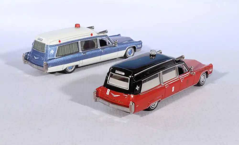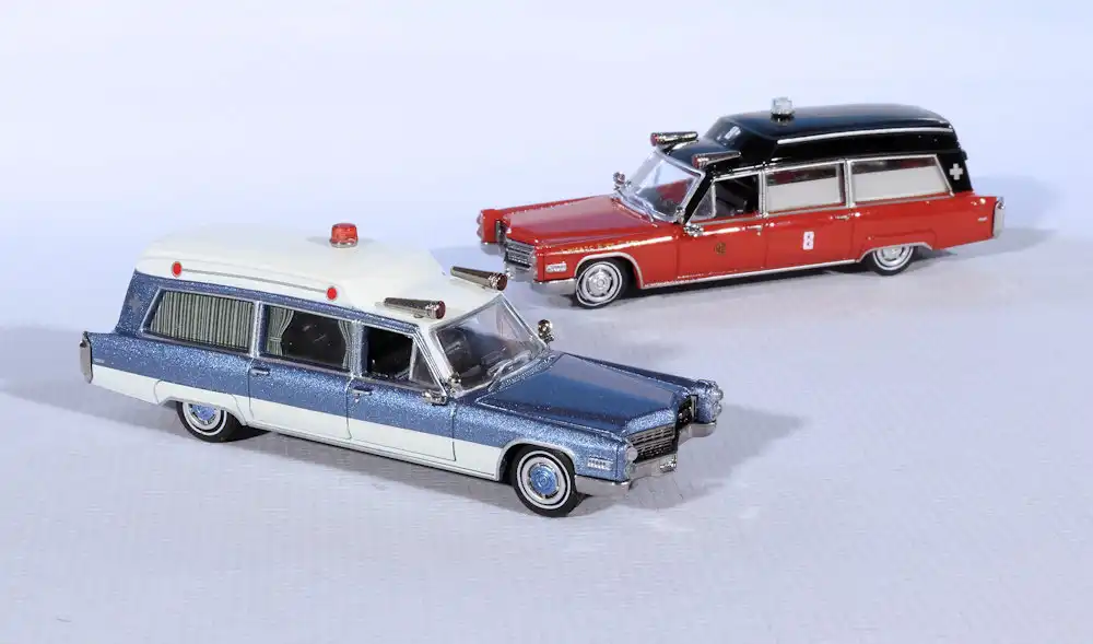 Ik had vroeger zo’n mooie Pontiac Superior Criterion van Dinky Toys, waarbij het lampje knipperde als hij reed. Aan die auto moest ik meteen denken toen ik de metallic blauwe Cadillac ambulance van Brekina zag. Het is de Cadillac Miller Meteor die als voorbeeld voor het 1:87-model werd gekozen, een imposante auto. Op de foto zijn twee versies te zien. Naast de genoemde blauwe staat een ambulance van de brandweer van Chicago. (BSg)