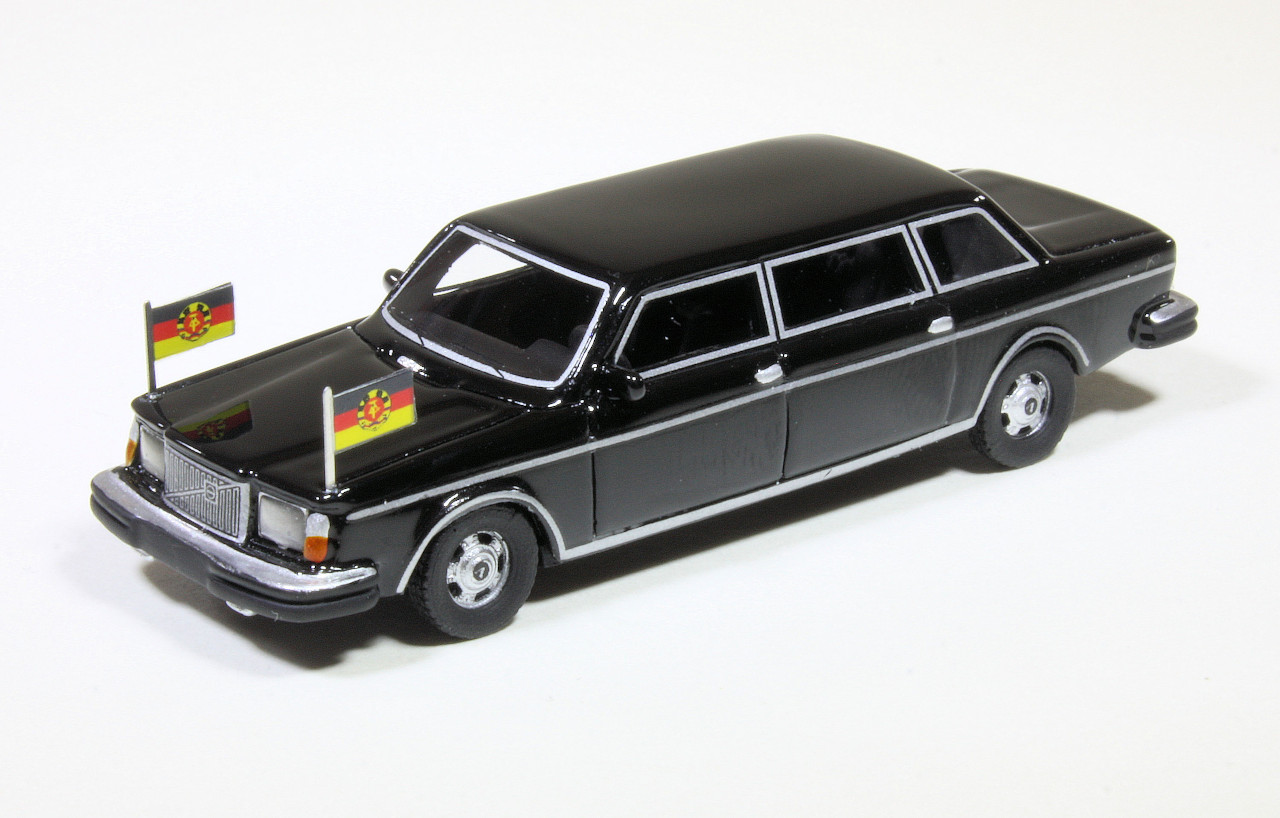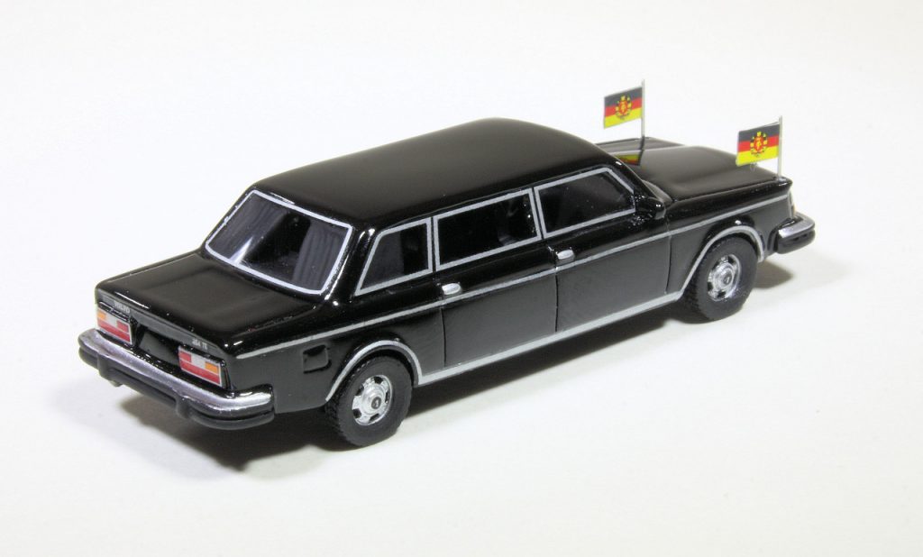 De Oost-Duitse leider Erich Honecker liet zich altijd vervoeren in een verlengde Volvo, zoals deze 264 TE. Een poosje geleden lieten we de civiele wagen al eens zien, maar hier is de dienstauto van Honecker, compleet met vlaggetjes en gordijntjes voor de ramen, gemaakt door BoS in schaal 1:87. (BSg)