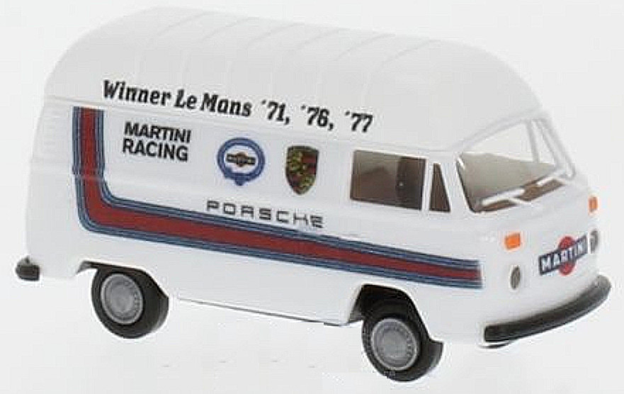 Brekina maakt op basis van de allang bestaande Volkswagen T2 bestelwagen met hoog dak de servicewagen van het Martini raceteam. Ze zijn (terecht) duidelijk trots op hun Le Mans-overwinningen in 1971, 1976 en 1977.