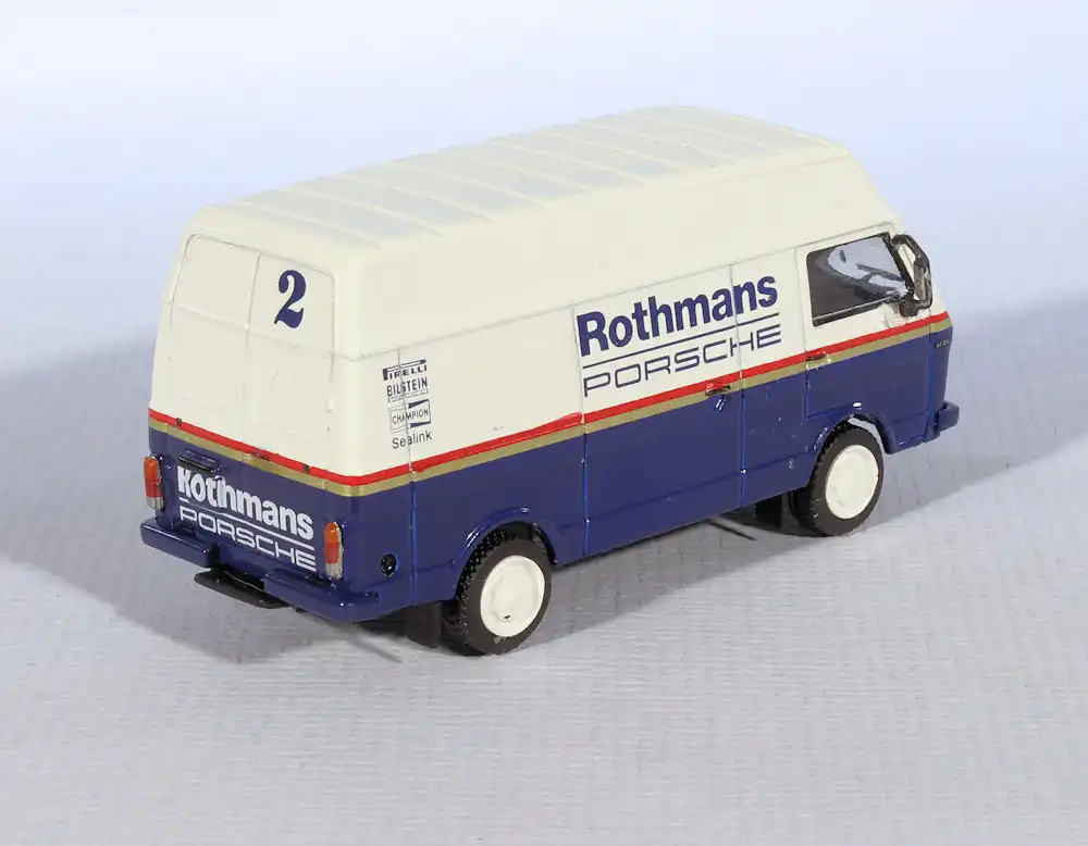 Op zoek naar auto’s die passen in het thema Race & Rally kwamen de ontwikkelaars van Brekina de Volkswagen LT tegen. Uiteraard kwam toen ook een foto van het Rothmans-Porsche team op tafel. Het is een net model van de LT 35 geworden en dat moet ook wel, want de concurrentie ligt op de loer. Viessmann zou nog de matrijzen van het ‘oude’ AWM model moeten hebben en die was ook niet slecht. (BSg)