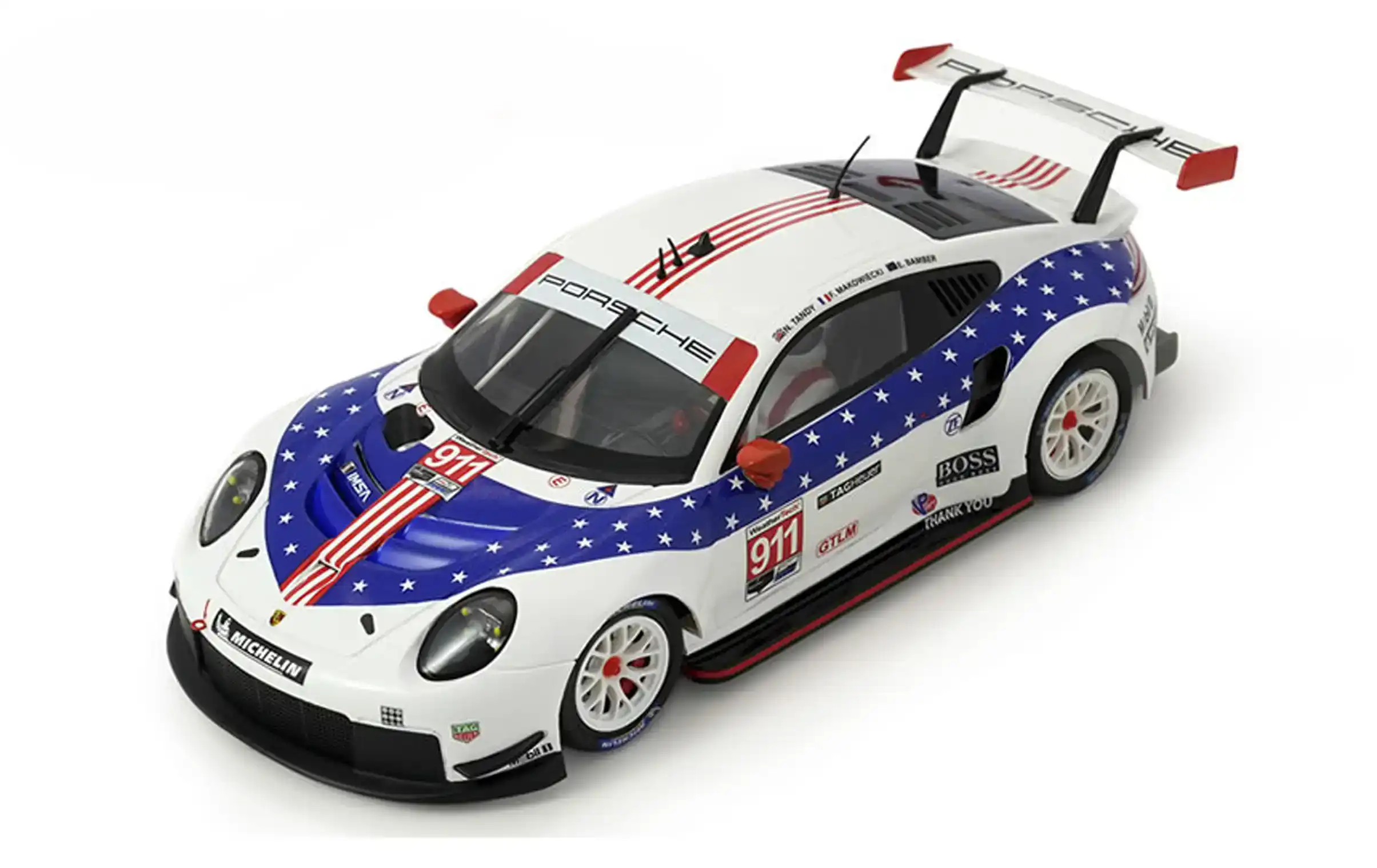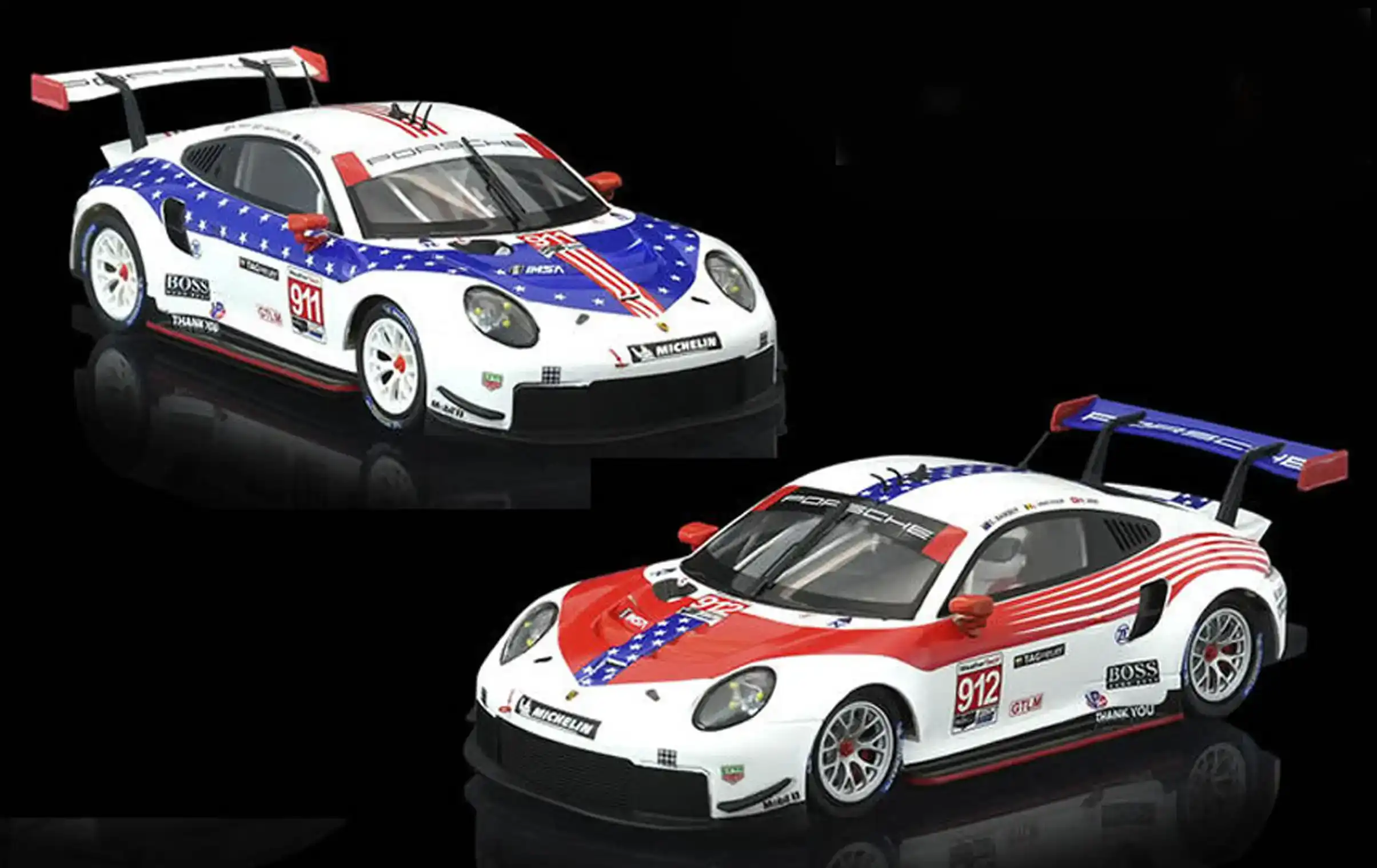 Scaleauto komt met de release van twee modellen: de officiële Porsches 911 GT3 RSR die deelnamen op 18 juli 2020 aan de race op Sebring. Twee iconische auto’s, twee speciale kleurstellingen, speciale startnummer # 911 en # 912 en vooral een hoogtepunt in het Porsche-endurance-verhaal. In 2020 kwam het officiële Porsche GT-team voor het laatst in actie in de GTLM-klasse van het IMSA-kampioenschap. Om dit afscheid te markeren, waren de twee 911 RSR’s uitgedost in een speciale en unieke kleurstelling. Bij de kwalificatie was Porsche # 911met de coureurs Frederic Makowiecki en Nick Tandy16e en eindigde de race op positie 17 . Porsche # 912 met Laurens Vanthoor en Earl Bamber stond op de 17e positie maar eindigde de race op plaats 14. Scaleauto heeft er wel werk van gemaakt. De modellen zien er onberispelijk en schitterend uit. Plaatjes op de baan en mogelijk in de vitrine. (BSij)