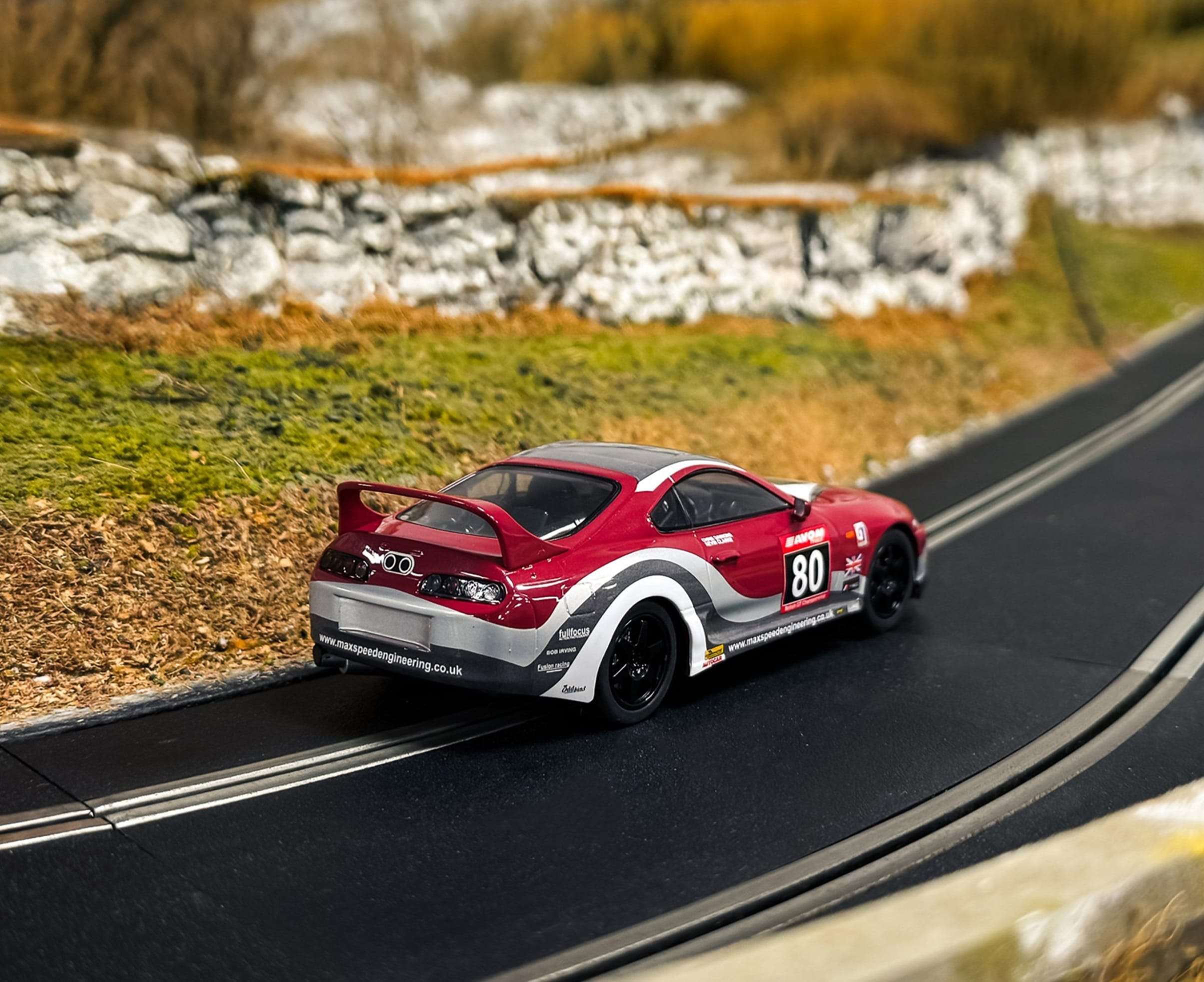 Het oude Britse slotcarmerk Scalextric brengt een Japanse krachtpatser, de Toyota Supra uit het British GT Championship van 2003 op de track. Het voertuig werd bestuurd door de coureurs Chris Dawkins en Kevin Clark. Auto #80 combineert de legendarische twin-turbo kracht van de Mk4 Supra met de opvallende rood-zilver-witte racekleuren. Van de agressieve carrosserie tot de authentieke race details toont dit model de vroege jaren van 2000 GT-racen op zijn best. Scalextric levert dit snelle Toyota wondertje in de correcte kleuren, met fraaie fijne lijnen en details en werkende verlichting zowel voor als achter. (BSij)